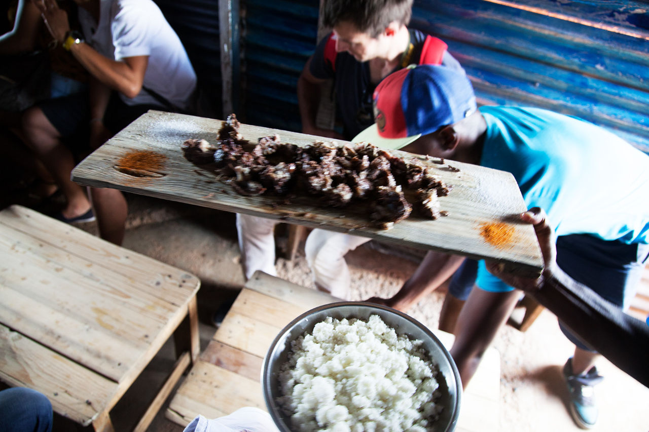 Inside the makeshift corrugated iron shelter boiled off-cuts of cow meat are laid out in front of us in one bowl and in another, hunks of pap. No one has a personal serving; instead everyone eats together from the shared meal, as custom dictates.